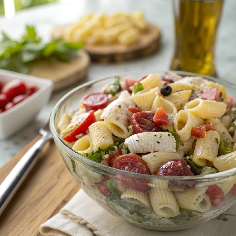 - Allow the fully assembled pasta salad to refrigerate for the full one hour minimum rather than serving it immediately because the three different halal meats, marinated artichokes, and sun-dried tomatoes all release their individual flavor compounds into the surrounding dressing during chilling and this gradual flavor exchange is what creates the deeply unified, cohesive Italian antipasto character that makes this easy cold pasta salad taste so much more developed than one assembled and served straight away