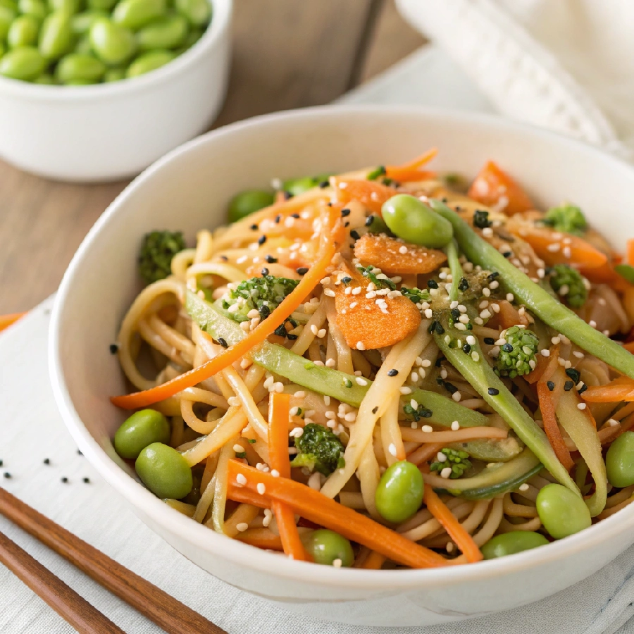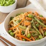 Asian cold pasta salad with ginger dressing combines tender noodles with edamame, crisp vegetables, sesame seeds, and a bold sesame-soy-ginger vinaigrette.