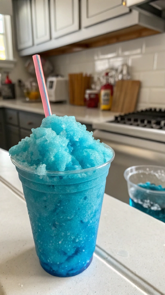 A vibrant Blue Raspberry Ice Slushie made with frozen blue raspberryโflavored liquid, crushed ice, and a splash of lime for a bright, icy, candyโlike frozen drink that tastes like a classic blue raspberry slush from your favorite snack bar.