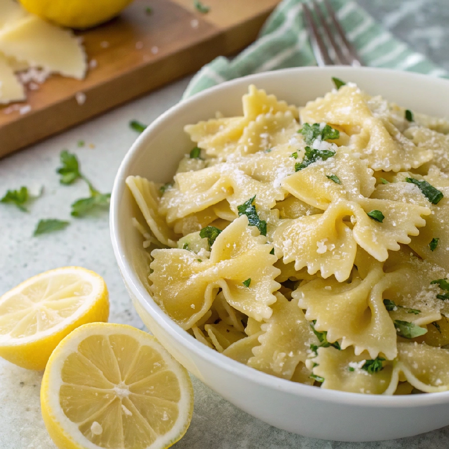 - Toss gently until each piece of farfalle is well coated with the bright lemon dressing.