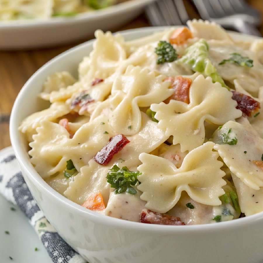 Creamy ranch bowtie pasta salad combines tender bowtie pasta with crisp vegetables, cheddar cheese, and a rich ranchโbased dressing.