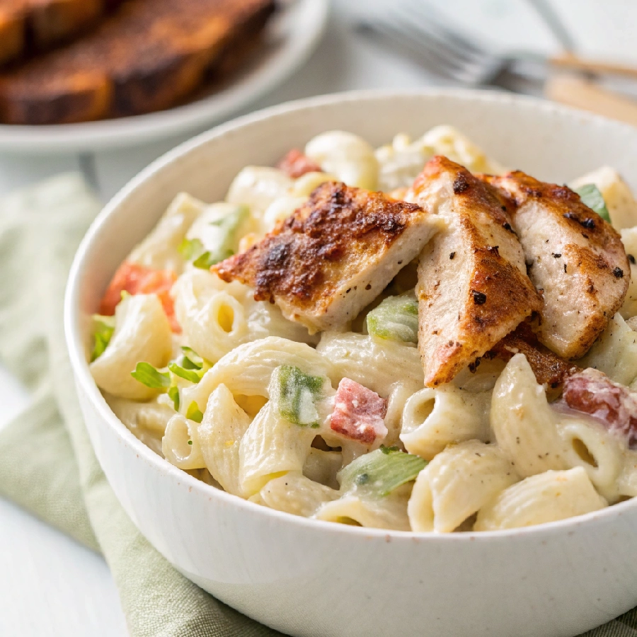 Creamy ranch shell pasta salad with smoky chicken combines tender shell pasta, smoked or grilled chicken, crisp vegetables, cheddar cheese, and a rich ranchโbased dressing.