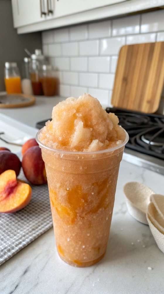 4. If the slushie is too thick, add a splash more peach tea; if too thin, add a few more ice cubes and blend briefly.