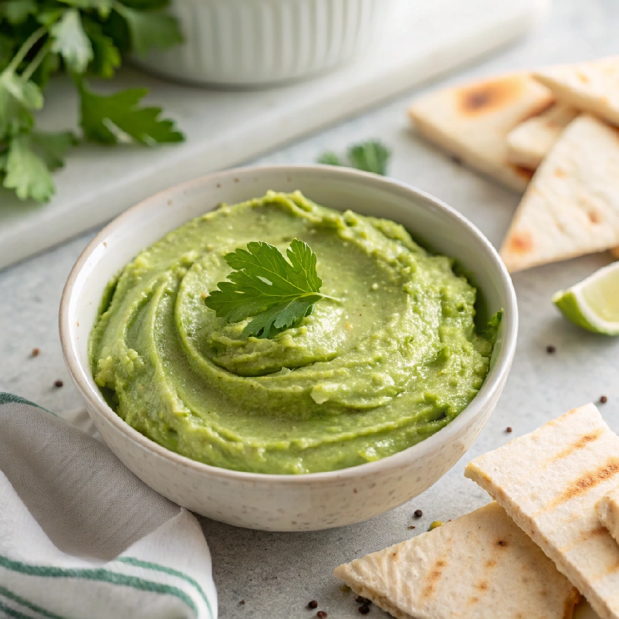 Green goddess hummus is a herbed, creamy hummus blending chickpeas with fresh parsley, basil, lemon juice, garlic, and a touch of avocado for extra richness.