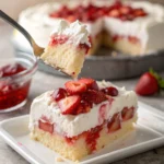 This strawberries and cream poke cake gives you a soft vanilla cake soaked with strawberry flavor, then topped with a fluffy cream layer and fresh berries. It feeds a crowd, slices clean, and tastes even better after a long chill, which makes it perfect for summer parties.