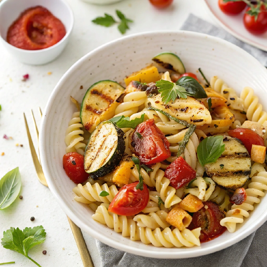 Summer pasta salad with grilled veggies and tomato vinaigrette combines tender pasta with smoky grilled zucchini, peppers, eggplant, and corn in a fresh tomato-herb dressing.