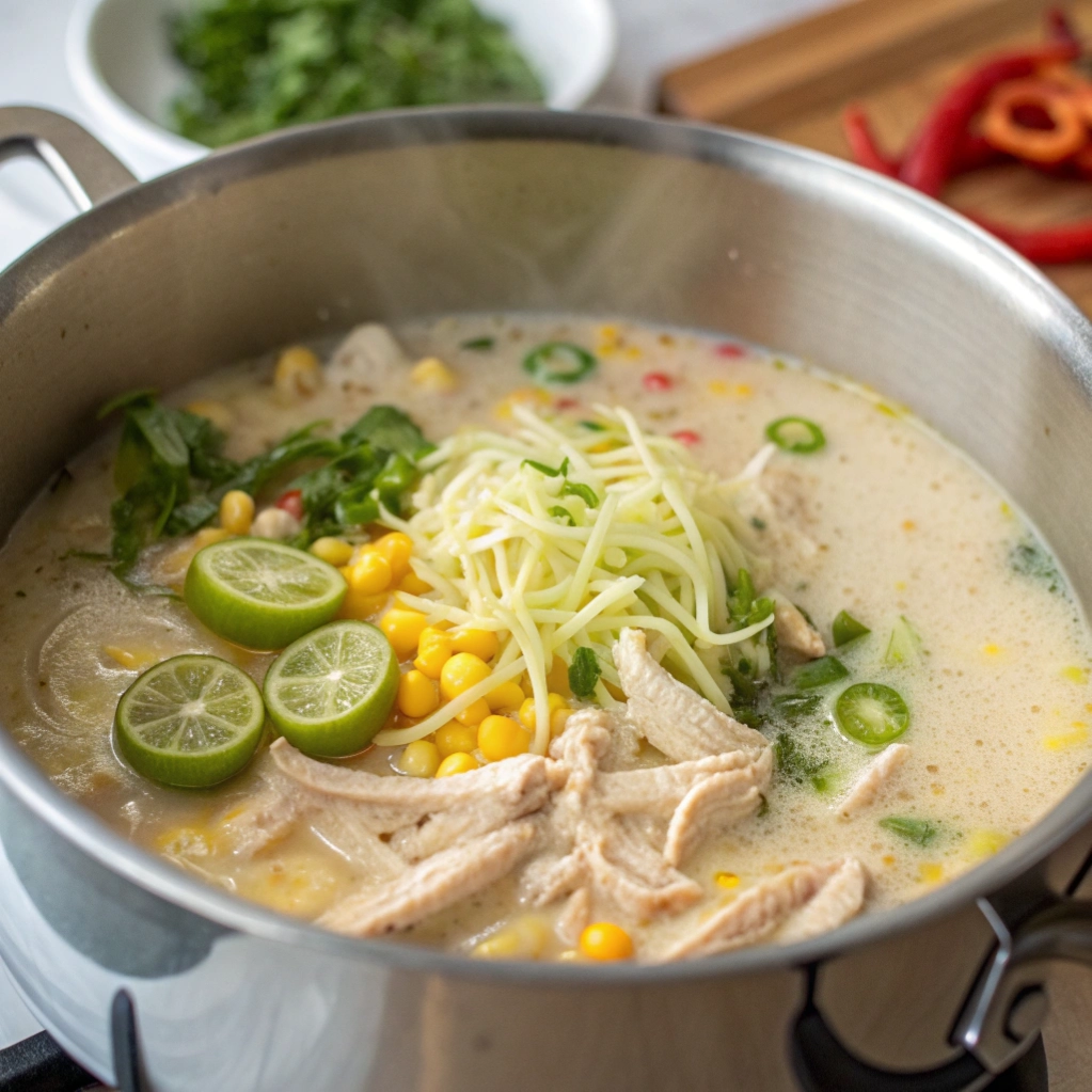 - Add Chicken: Stir in the shredded cooked chicken and simmer for another 5 minutes until the chicken is heated through.